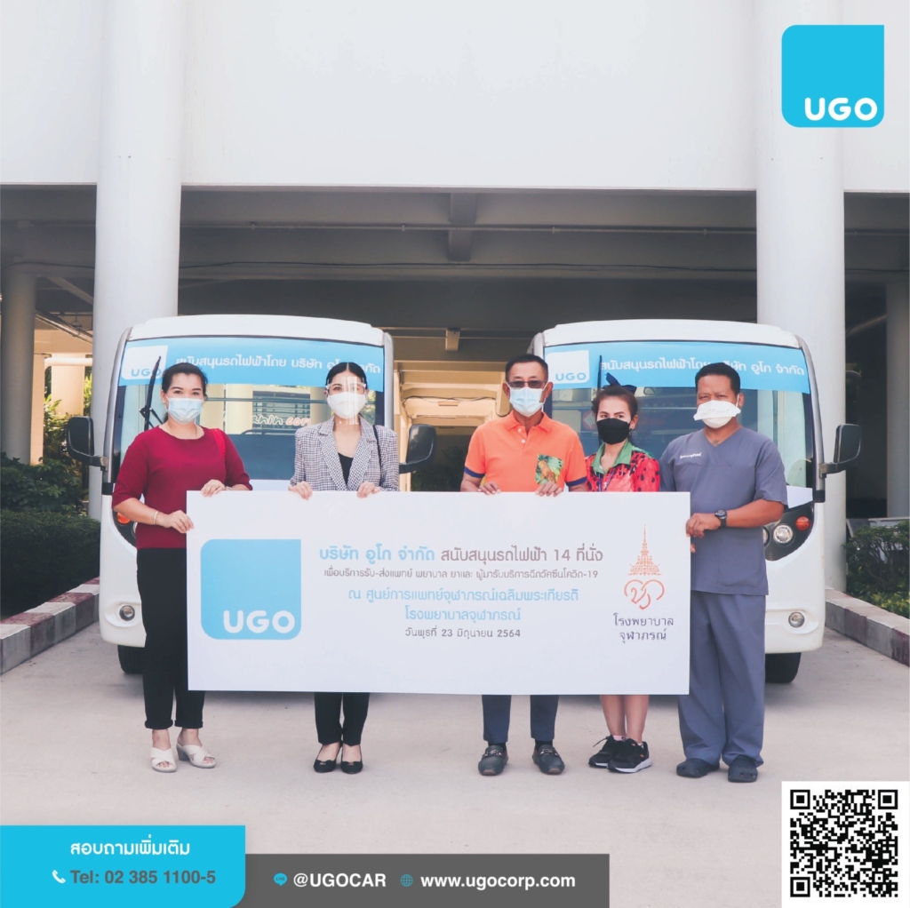 วันพุธที่ 23 มิถุนายน 2564 บริษัท อูโก จำกัด โดยตัวแทนฝ่ายบริหารได้สนับสนุนรถไฟฟ้า 14 ที่นั่ง จำนวน 2 คัน เพื่อบริการรับ-ส่งแพทย์ พยาบาล ยาและผู้มารับบริการฉีดวัคซีนโควิด-19 ณ ศูนย์การแพทย์จุฬาภรณ์เฉลิมพระเกียรติ โรงพยาบาลจุฬาภรณ์